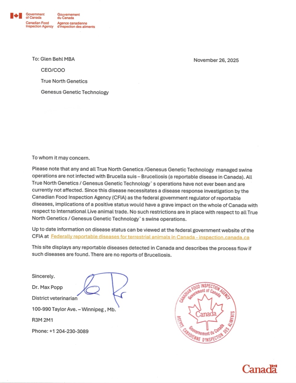 True North Genetics is sharing the official CFIA confirmation that all True North Genetics / Genesus Genetic Technology operations remain free of Brucella suis (Brucellosis) and all other CFIA-monitored porcine diseases.